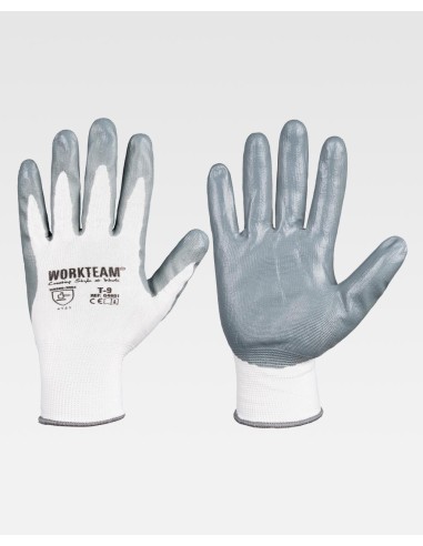 Guante de nitrilo de la marca de Workteam blancos, con el recubrimiento de color gris con el puño elástico.