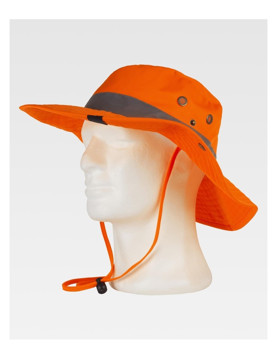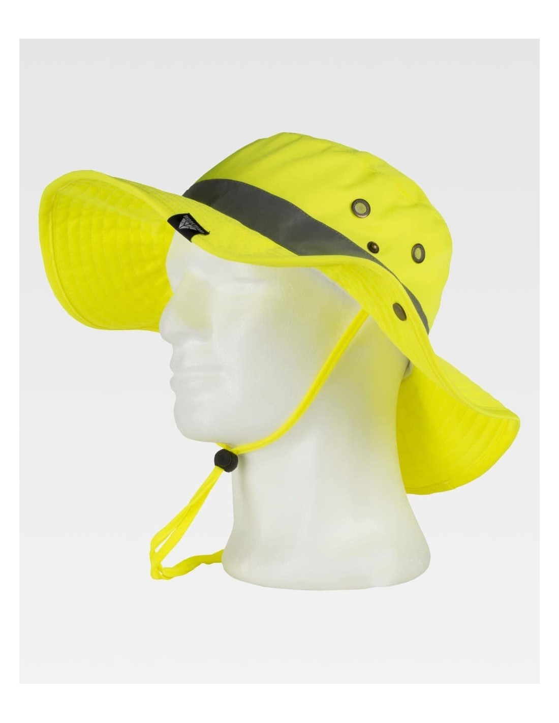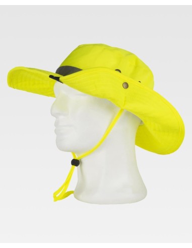 Gorro de tipo safari de la marca de Workteam con ala ajustable con cierre de corchete metálicos y un cordón a juego con el color principal, gorro de la marca de Workteam confortable con el interior forrado y con varios orificios de ventilación en los laterales reforzados con varias argollas metálicas.