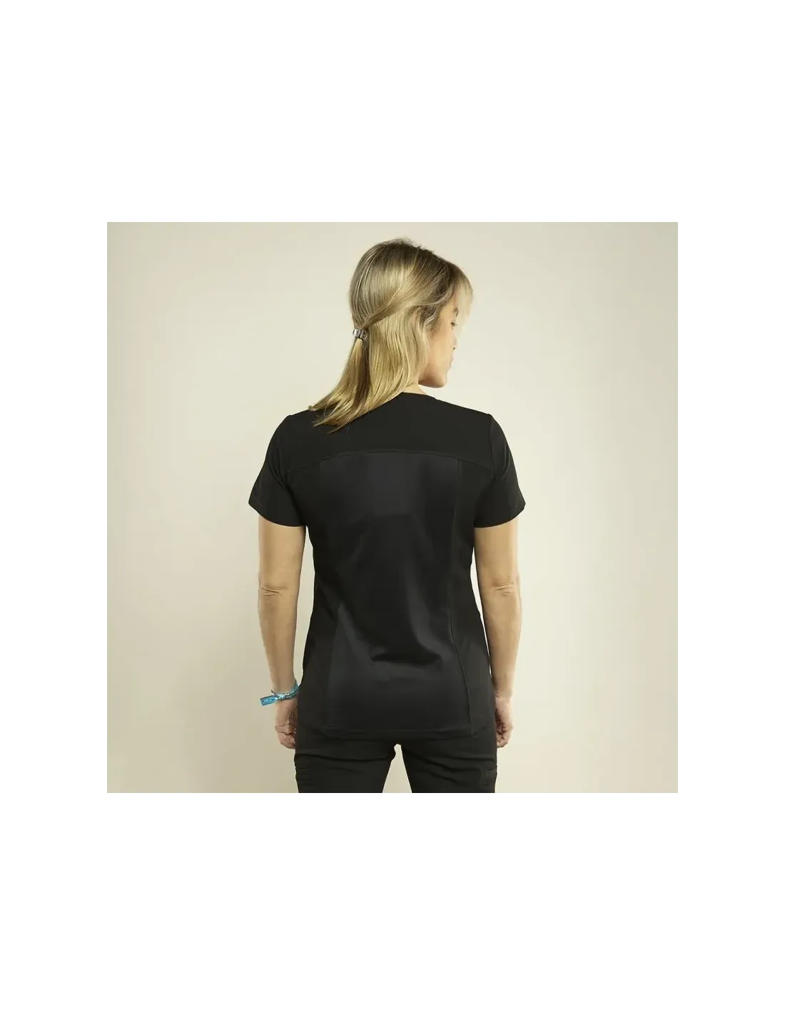 Casaca sanitaria para mujer de la marca Impulso, una prenda elástica y cómoda con el cuello acabado en V, con iones de plata en su tejido antibacteriano y bolsillos lateriales.