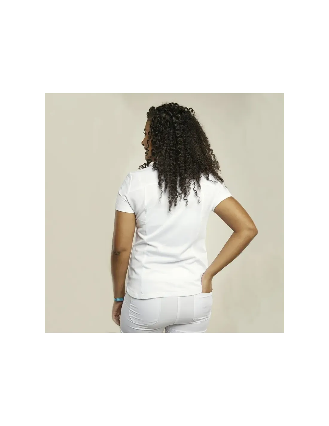 Casaca sanitaria para mujer de la marca Impulso, una prenda elástica y cómoda con el cuello acabado en V, con iones de plata en su tejido antibacteriano y bolsillos laterales.