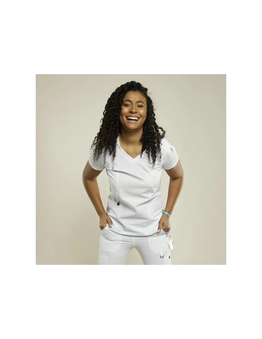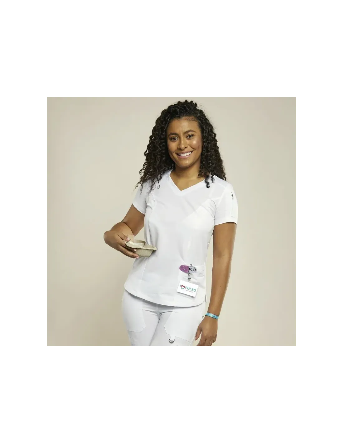 Casaca sanitaria para mujer de la marca Impulso, una prenda elástica y cómoda con el cuello acabado en V, con iones de plata en su tejido antibacteriano y bolsillos lateriales.