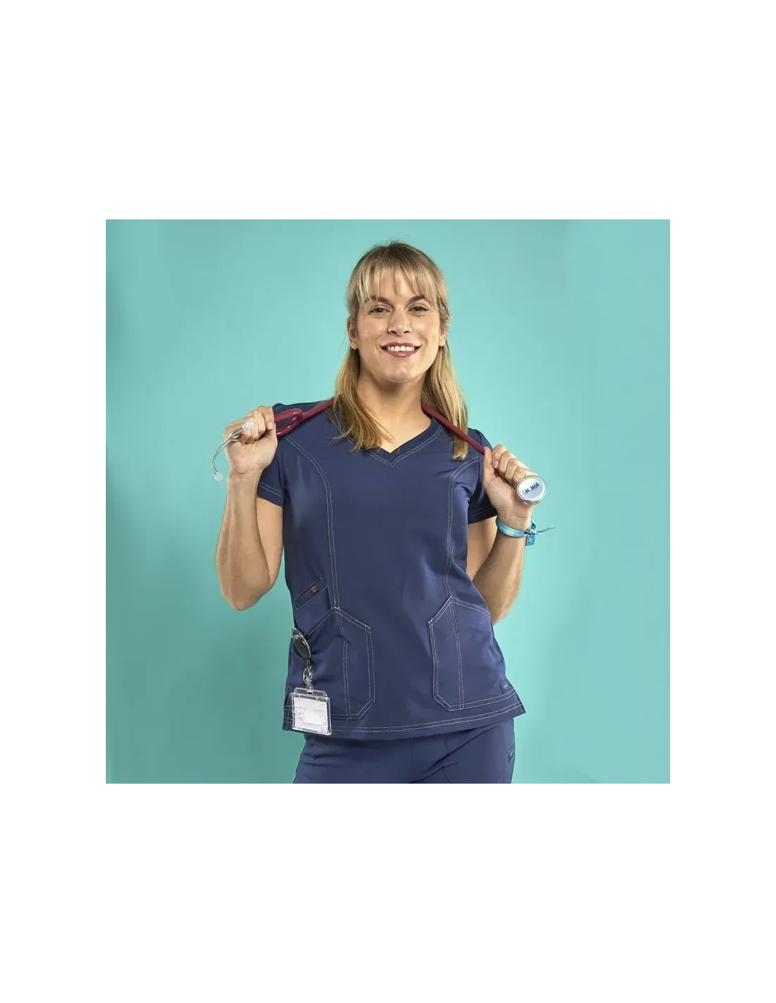 Casaca para mujer de tejido antibacteriano modelo ENERGY. Una casaca de la línea pressence que está compuesta por un 5% spandex y un 95% poliéster lo que la hace una prenda con buena caída, fácil planchado y anti olor, entallada y con cuello en V.