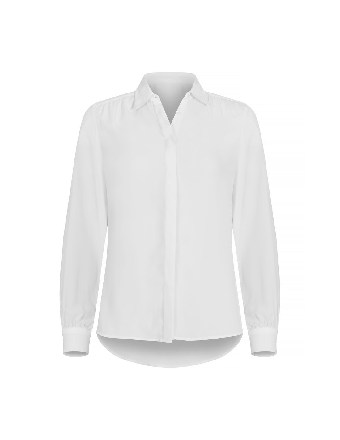 Esta blusa clásica se puede usar en cualquier época del año. Está elaborada con un tejido ligero y semitransparente, y cuenta con un cierre de botones ocultos y pliegues en la parte delantera y en los puños, además de canesú en la espalda. Disponible en colores blanco y negro.
