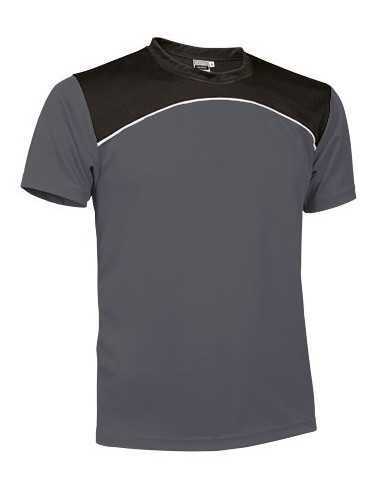 Camiseta ligera tricolor, especialmente preparada para hacer deporte por su confección en tejido técnico transpirable, que facilita la evacuación del sudor corporal. Vivo curvado en delantero y espalda, manga corta, cuello redondo y doble pespunte en bajo, cuello y mangas. Diseñada en colores fuertes combinados con negro y un vivo de color blanco. Ideal para vestir equipos y grupos deportivos.