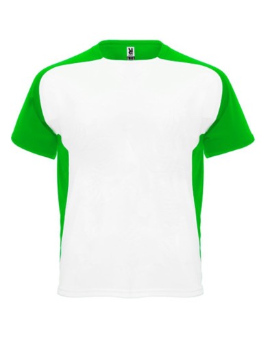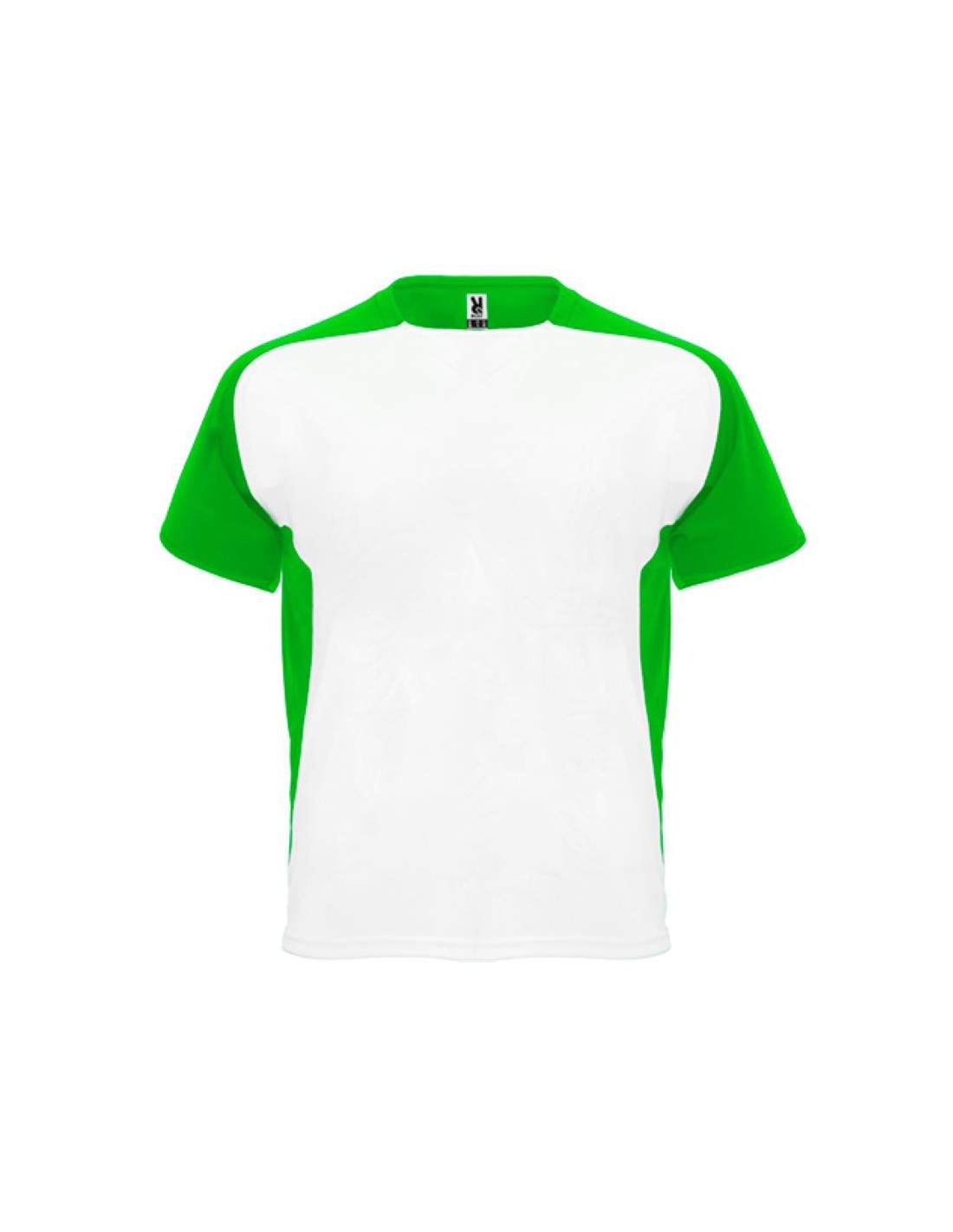 Es una camiseta de manga corta con el cuello redondo. Esta hecha de 100% poliéster, 140 g/m2. Es una camiseta bicolor perfecta para usar en cualquier tipo de deporte que te guste. Tiene diez colores distintos para que lo puedas conjuntar con cualquier pantalón. Este modelo es transpirable. Es suave, ligero y de fácil secado. Las mangas y paneles laterales a contraste.