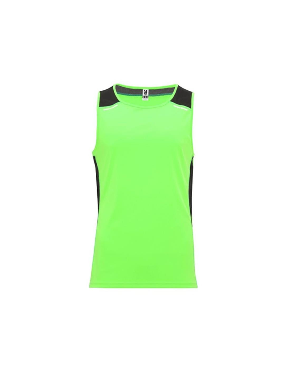 Es una camiseta de tirantes anchos tricolor y unisex modelo Misano. Es de la marca Roly.