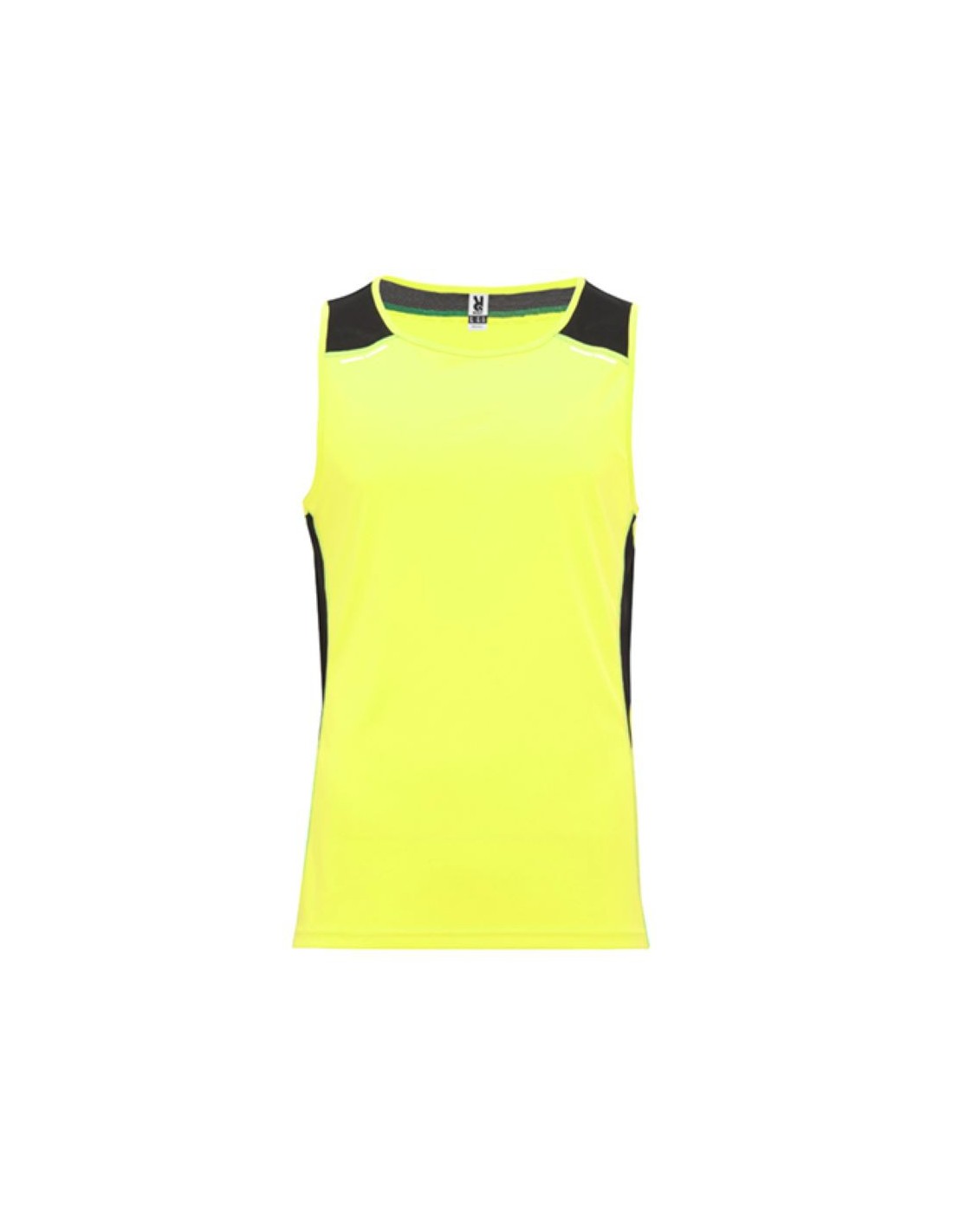 Es una camiseta de tirantes anchos tricolor y unisex modelo Misano. Es de la marca Roly.