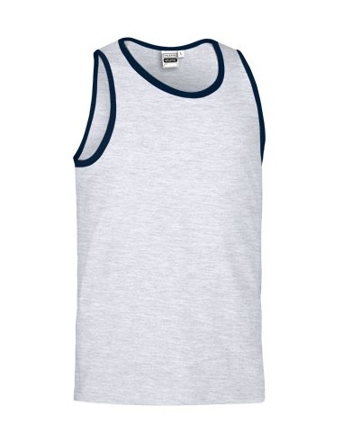 Camiseta de corte clásico, sin mangas, confeccionada en tejido de punto liso 100% algodón peinado. Tirantes anchos, cuello redondo más amplio y sisas ribeteadas. Disponible en un amplio surtido de colores incluyendo dos combinaciones bicolor. Ideal para ambientes cálidos.* Gris vigoré: 98% algodón / 2% viscosa