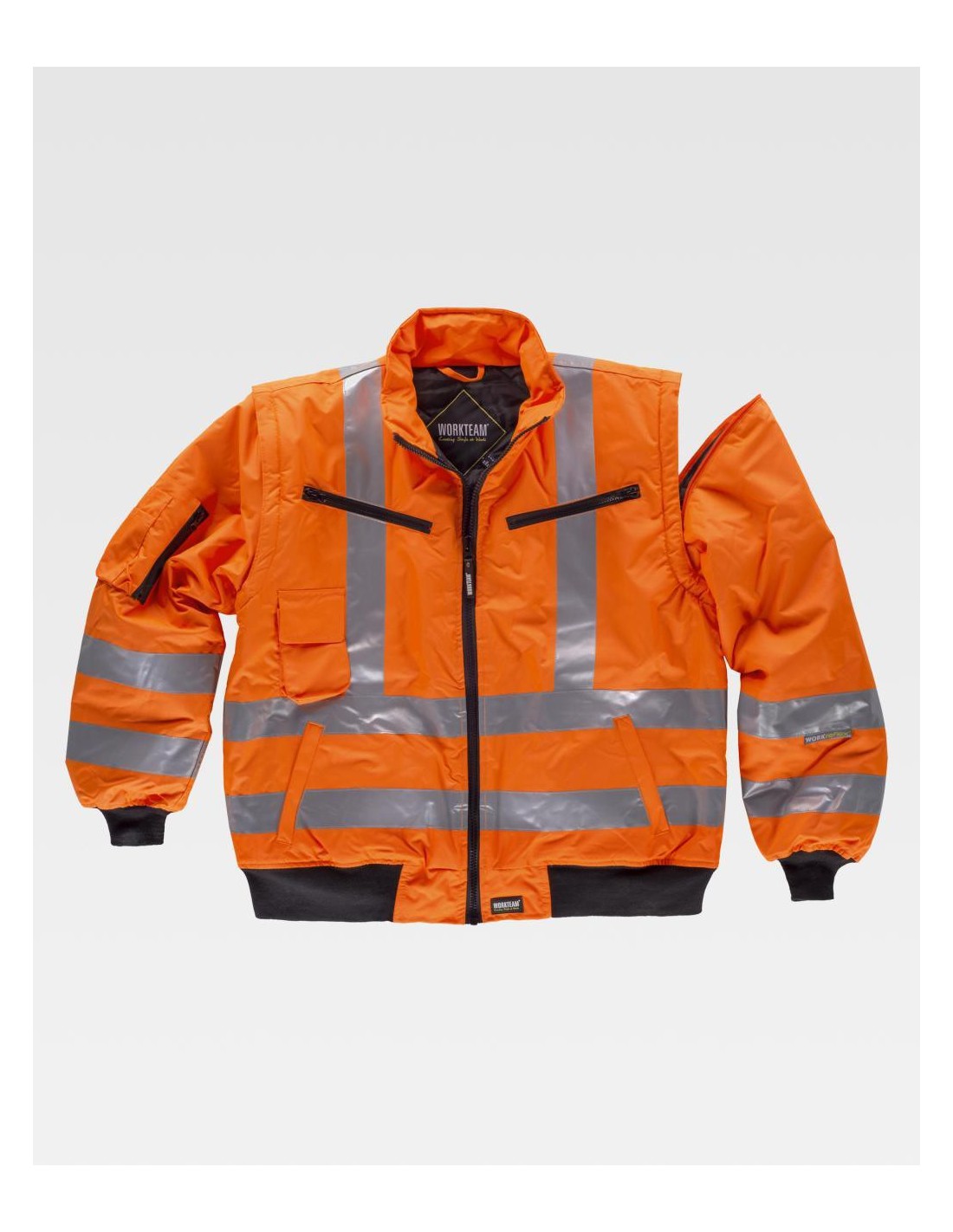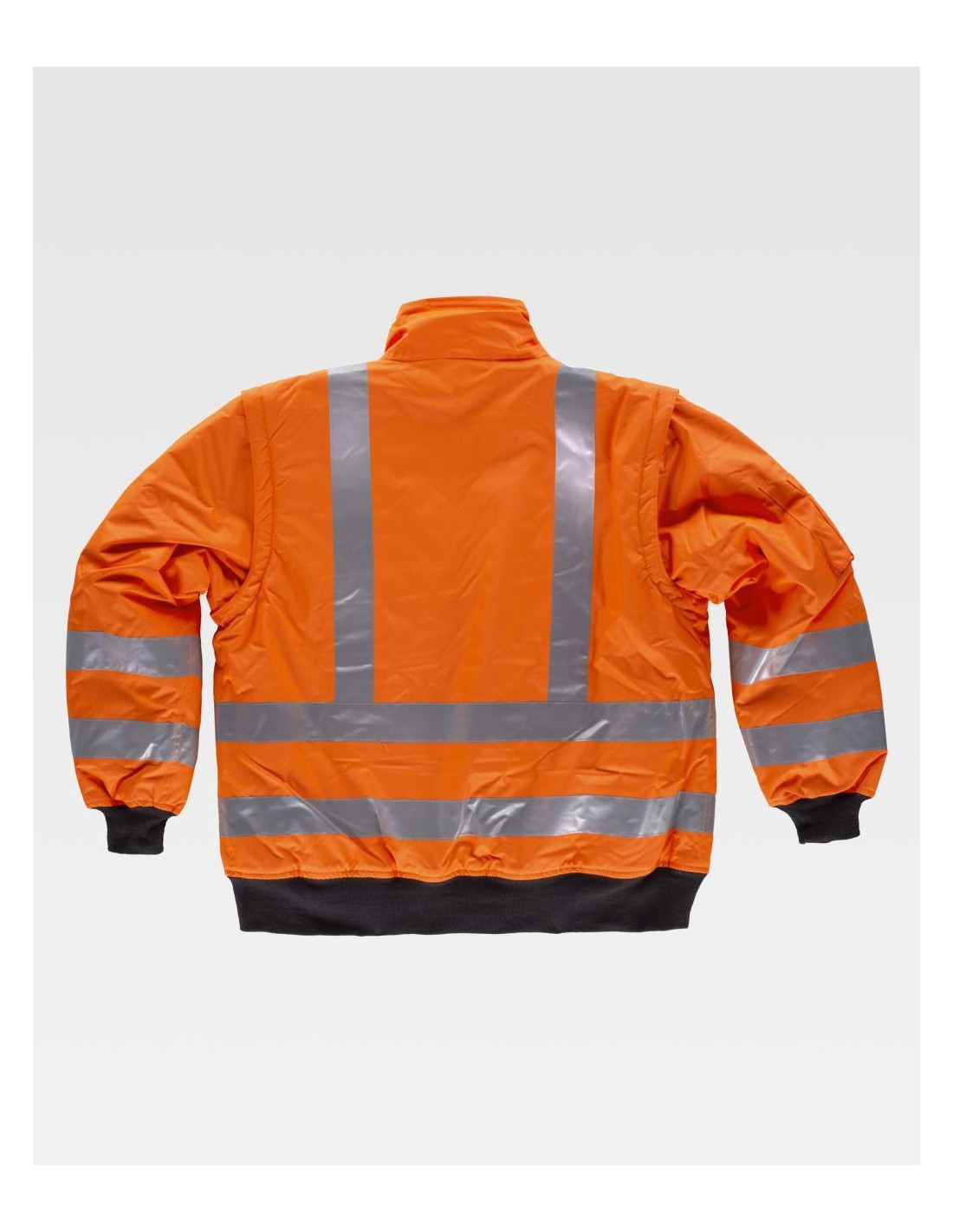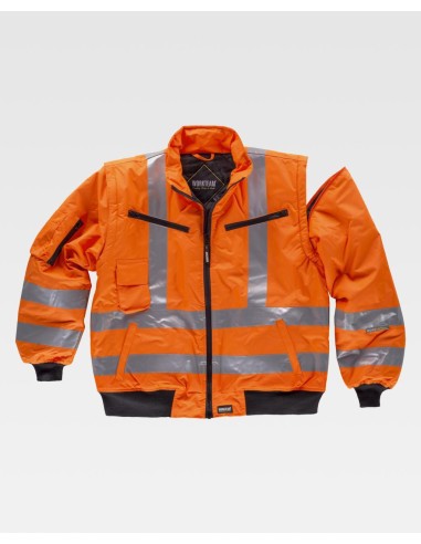 Cazadora Piloto acolchada e impermeable en tejido Oxford, de alta visibilidad, con mangas desmontables y cintas reflectantes. Disponible en colores amarillo flúor y naranja flúor.
