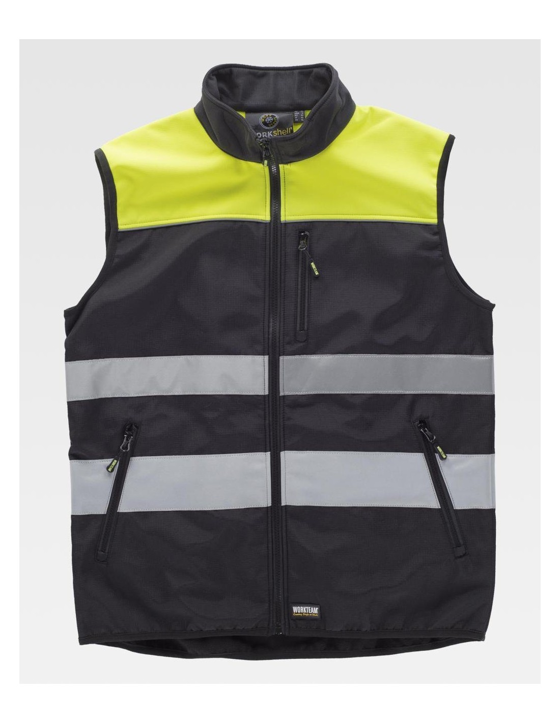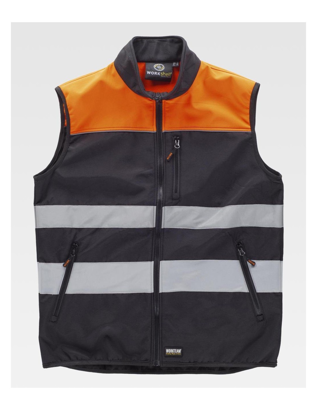 Chaleco Workshell con tejido Ripstop combinado con canesús y cintas reflectantes. Cuello alto y cierre de cremallera de nylon. Un bolso de pecho y dos laterales interiores con cremalleras de nylon. Un bolso de plastón con cierre de cremallera en el interior. Dos cintas reflectantes de distinto tamaño en pecho y espalda. Vivos reflectantes. Ribeteado con bies. Tejido corta vientos, repelente al agua y resistente al desgarro con membrana interior transpirable y aislante e interior de alta capacidad térmica. Composición 96% Poliéster 4% Elastano