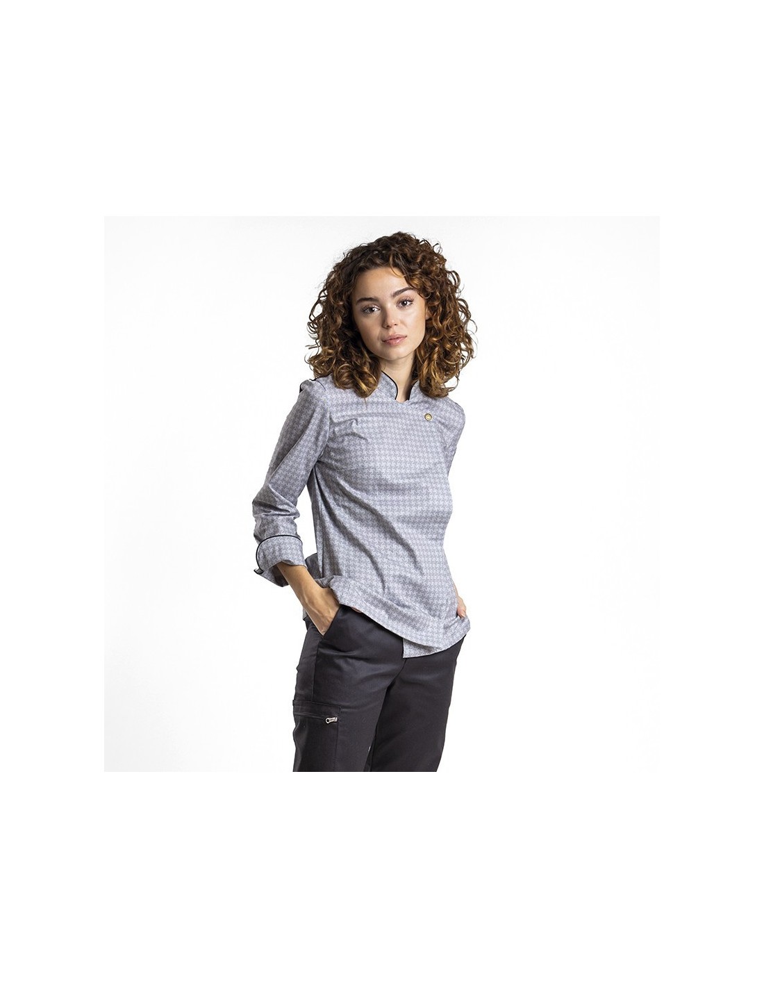 Esta chaqueta de cocina contiene un tejido gabardina elástica, cuenta con un diseño joven, fresco y muy actual. Presenta un estampado de molinillos, manga rollup, sujetadelantal y la espalda transpirable.