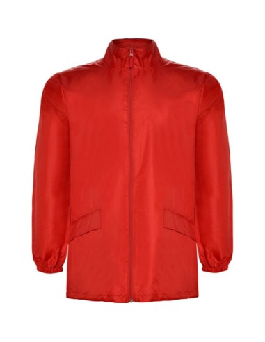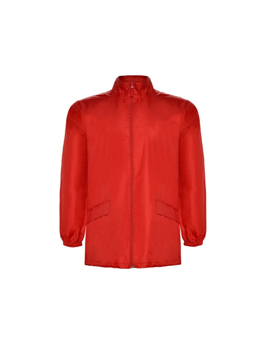 Chubasquero de cuello alto con cremallera completa, bajo con cordones ajustables y topes. Capucha plegada en el cuello con cordones, puños elásticos y 2 bolsillos con solapa y cierre velcro.
