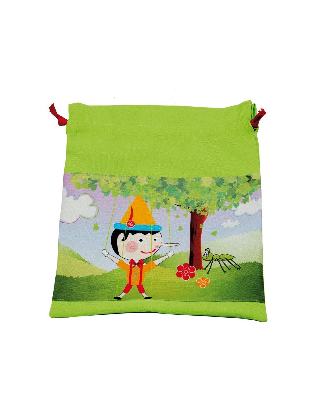 Bolsa para guardar merienda modelo Pinocho, una bonita bolsa en color pistacho con tiras rojas con estampado de pinocho en el parque.
