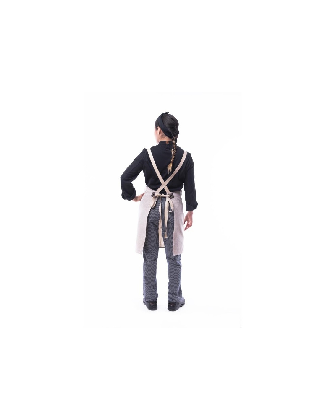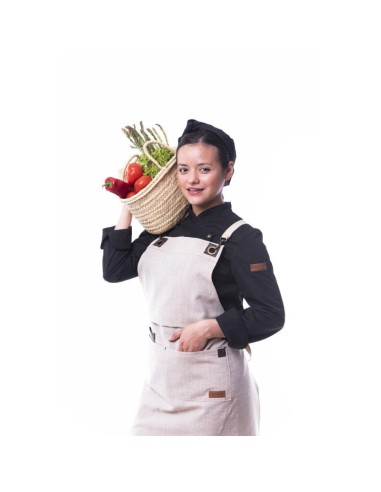 Este delantal presenta la espalda cruzada con tirantes ajustables y las cintas cruzadas. Contiene varios detalles en cuero y unas de las ventajas son su ligereza y frescor.