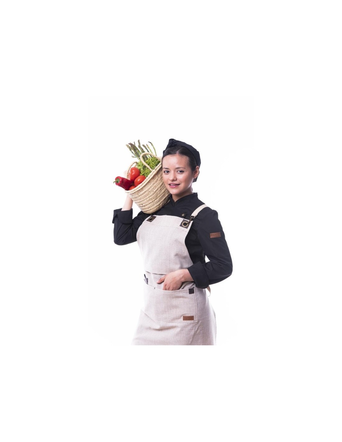 Delantal de peto que cuenta con tres bolsillos en la zona delantera, además de un tirante del cuello fijado con botones de presión y para anudar en los laterales. Disponible en negro, turquesa, albero y verde caqui.