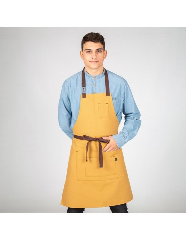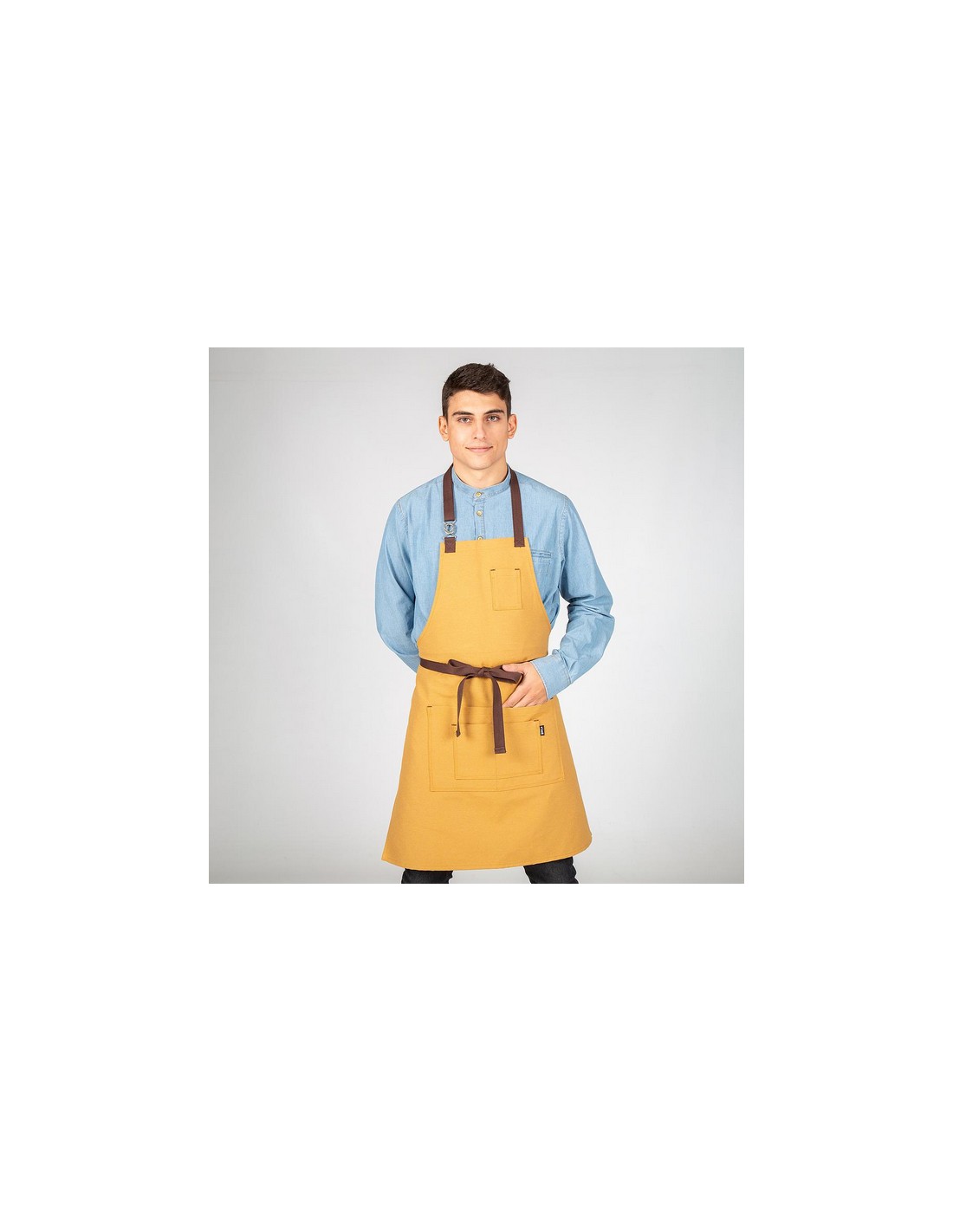 Este delantal de peto cuenta con cinco bolsillos en la parte delantera. Incluye un sistema de cierre mediante hebilla entrelazada en el tirante del cuello, y además cuenta con tiras laterales para anudar. Este delantal es ideal como uniforme para profesiones que trabajen en un comercio perteneciente al sector de la hostelería. Disponible en colores albero, gris, rojo, verde caqui y gris marengo.