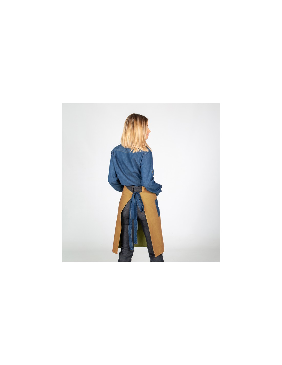 Delantal con peto, cuenta con cuatro bolsillos en la zona delantera, además de un tirante del cuello fijado con hebilla metálica regulable y tiras para anudar. Disponible en CANVAS albero o verde oliva combinado con tejano añil en bolsillos.