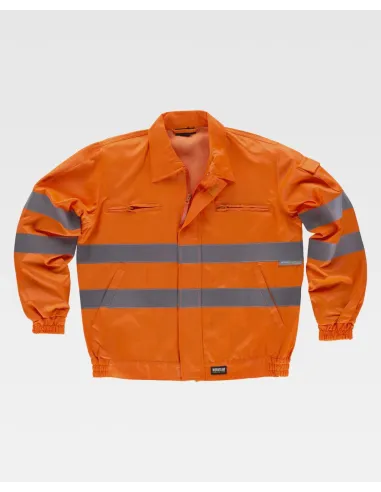 Cazadora de alta visibilidad con cintas reflectantes. Disponible en colores amarillo visibilidad y naranja visibilidad.
