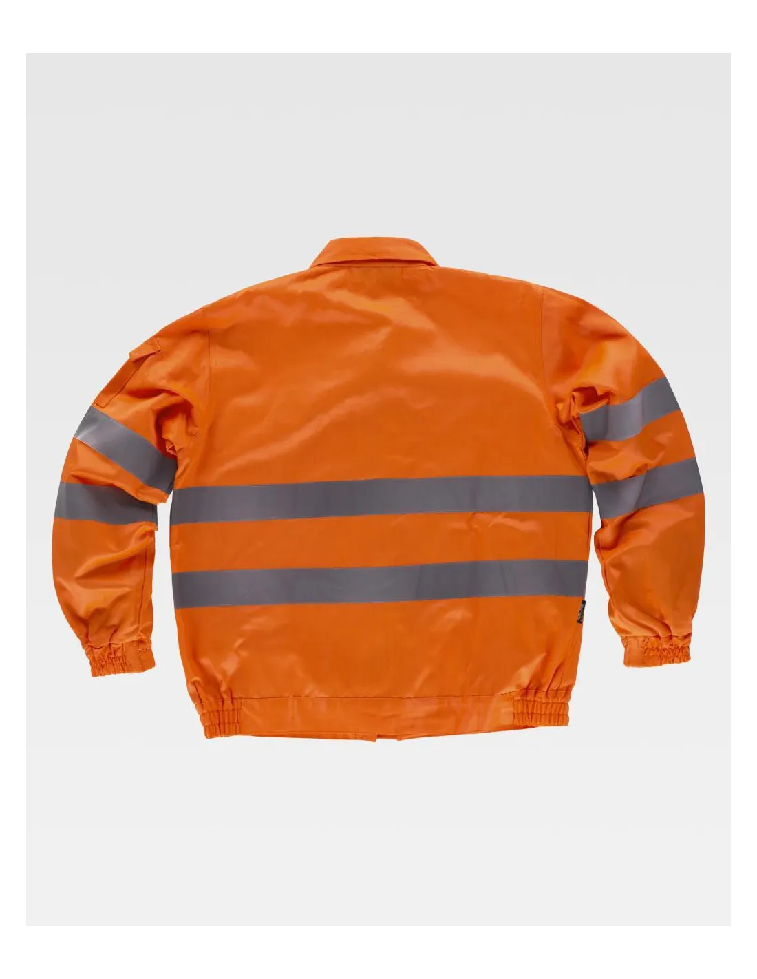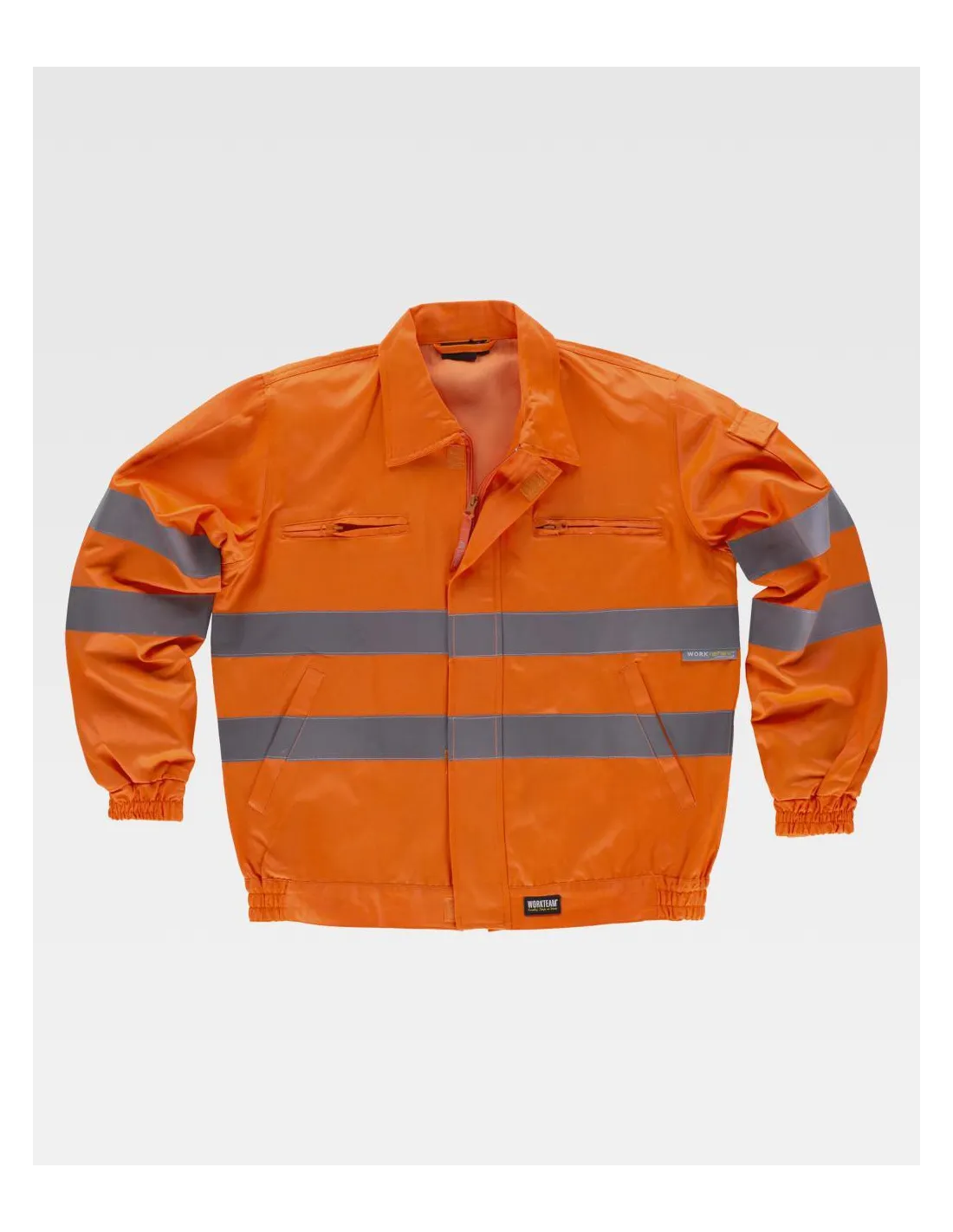 Cazadora de alta visibilidad con cintas reflectantes. Cuello camisero y cierre de cremallera de nylon oculta por solapa postiza con velcro. Dos bolsos de pecho interiores con cierre de cremallera de nylon y dos bolsos laterales de ojal con cierre de corchete. Un bolsillo en la manga con cartera y velcro. Dos cintas reflectantes en pecho, espalda y mangas. Puño con elástico. Cierre de velcro en cintura y elástico en los laterales. Composición 50% Poliéster 50% Algodón