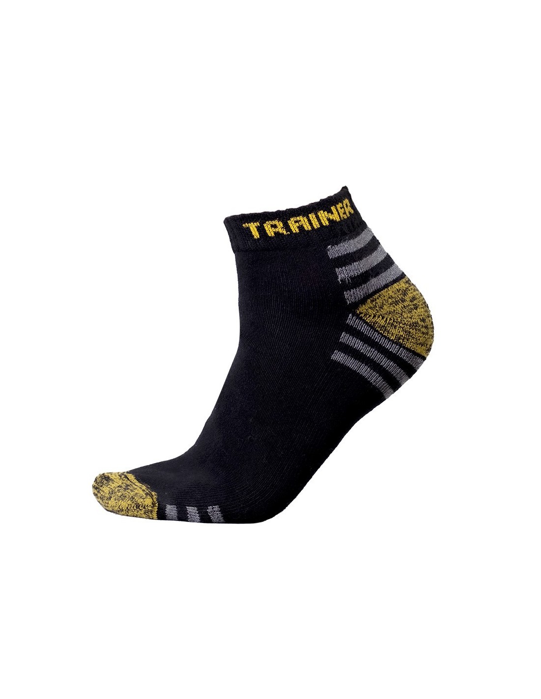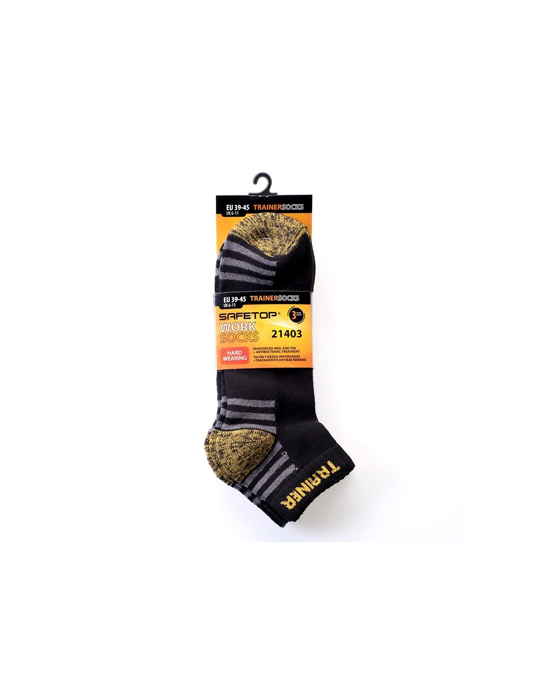 El producto 21403 de la marca Safetop es un pack de 3 pares de calcetines cortos en color negro con detalles en gris y amarillo. Estos calcetines son de talla única (39-45) y tienen el talón y la puntera reforzados, para mayor amortiguación, especialmente diseñados para trabajos duros y condiciones difíciles. Los calcetines están hechos con tejido acolchado muy flexible y duradero, con protección antibacteriana para unos pies más frescos. Son ideales para usar con zapatos de seguridad o zapatillas pesadas con punta de acero.