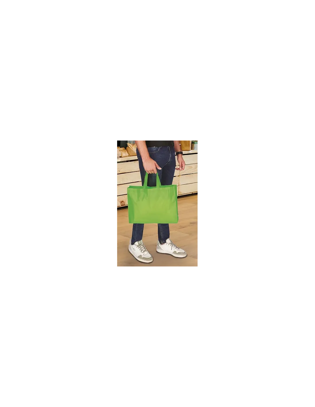 Su composición es 100% polipropileno con una densidad de 100 g/m², asegurando consistencia, firmeza y un excelente rendimiento como bolsa reutilizable.