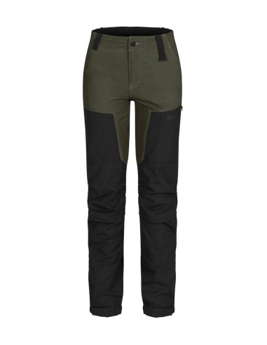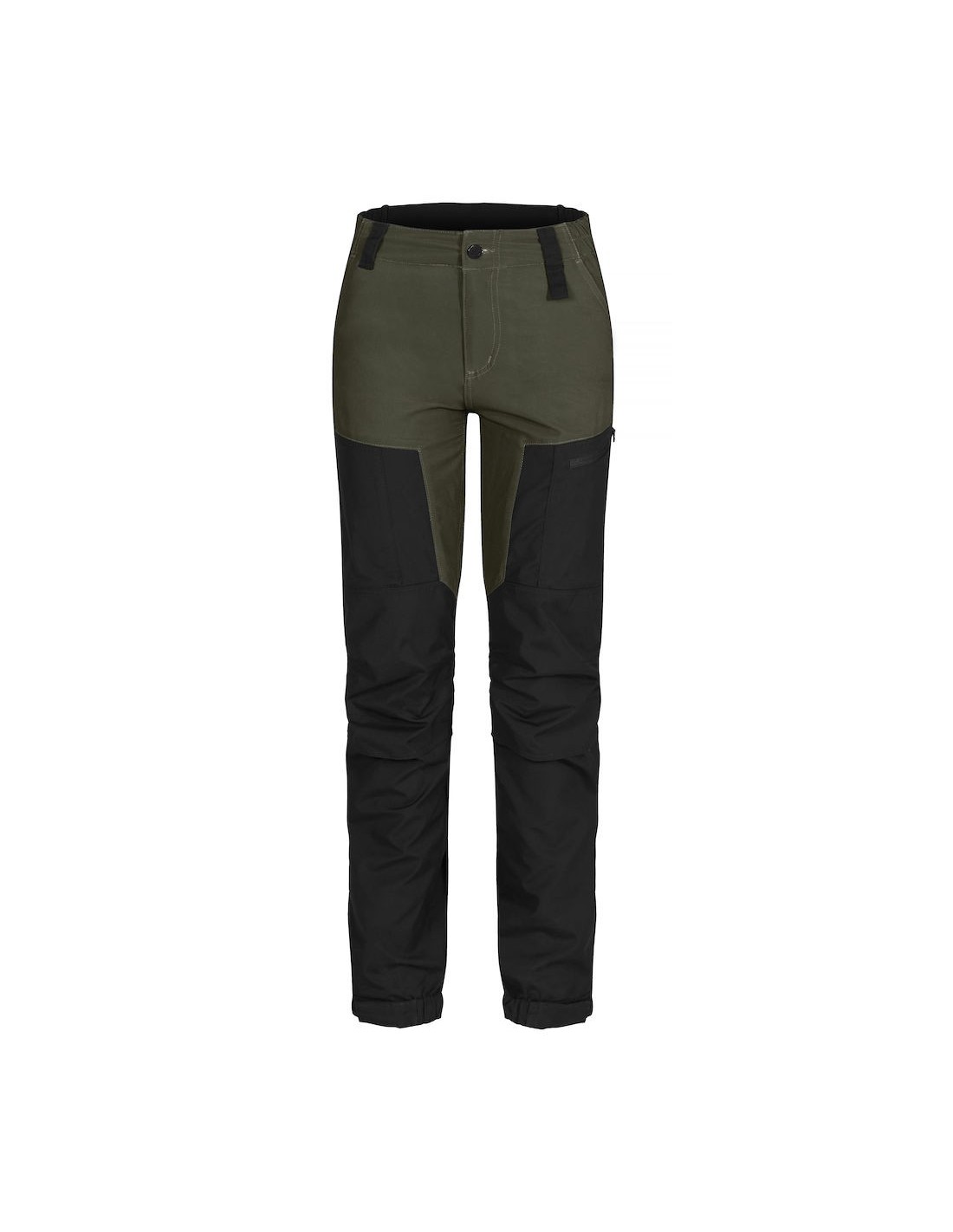 Pantalón de trekking confeccionado en tejido resistente al viento y al agua. Este modelo tiene corte de mujer. Cuenta con elásticos en cintura y rodilla, además de dos bolsillos delanteros, dos bolsillos con cremallera en la pierna y uno detrás. Disponible en colores naranja, verde y negro.