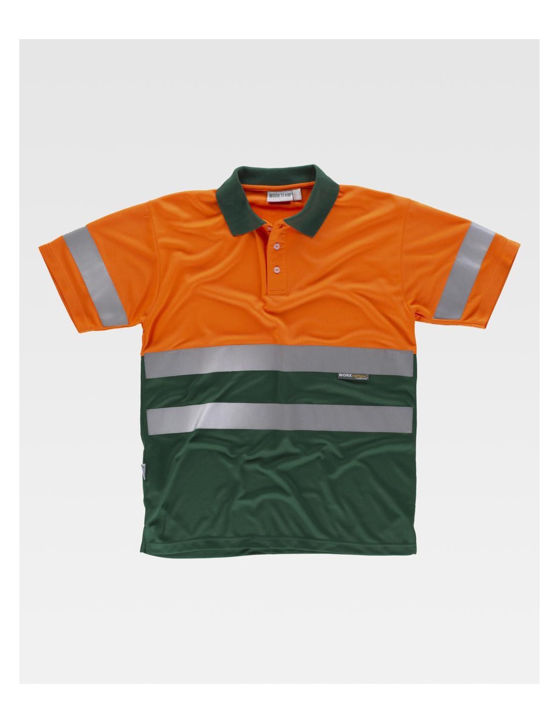 Polo combinado de manga corta en poliéster ojo de perdiz con cintas reflectantes. Parte superior de alta visibilidad. Cuello clásico con tapeta de tres botones y cubrecosturas interior. Aberturas laterales. Una cinta reflectante en mangas y dos en pecho y espalda. Tejido fresco y ligero de alta permeabilidad al aire. Transpirable, de fácil secado y resistente al encogimiento. Cuello en punto canalé. Composición 100% Poliéster
