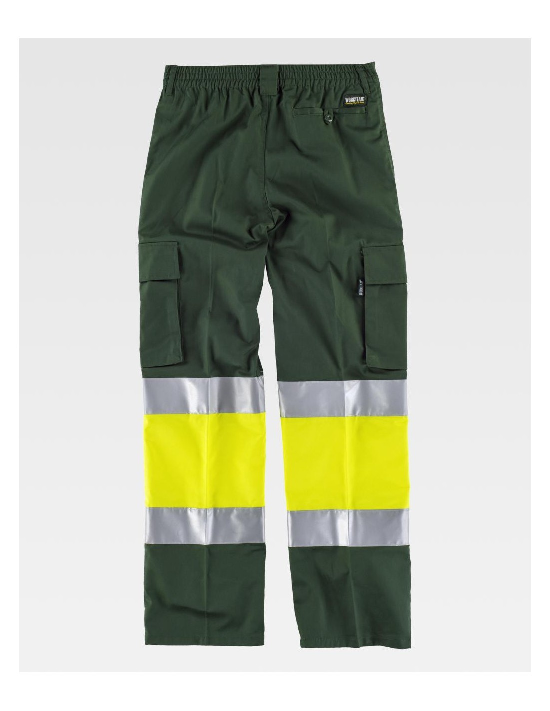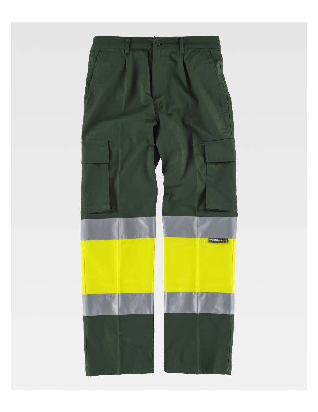 Pantalón combinado con alta visibilidad y cintas reflectantes. Confeccionado en poliéster y algodón; disponible en varias combinaciones de colores.