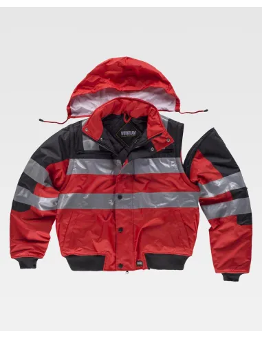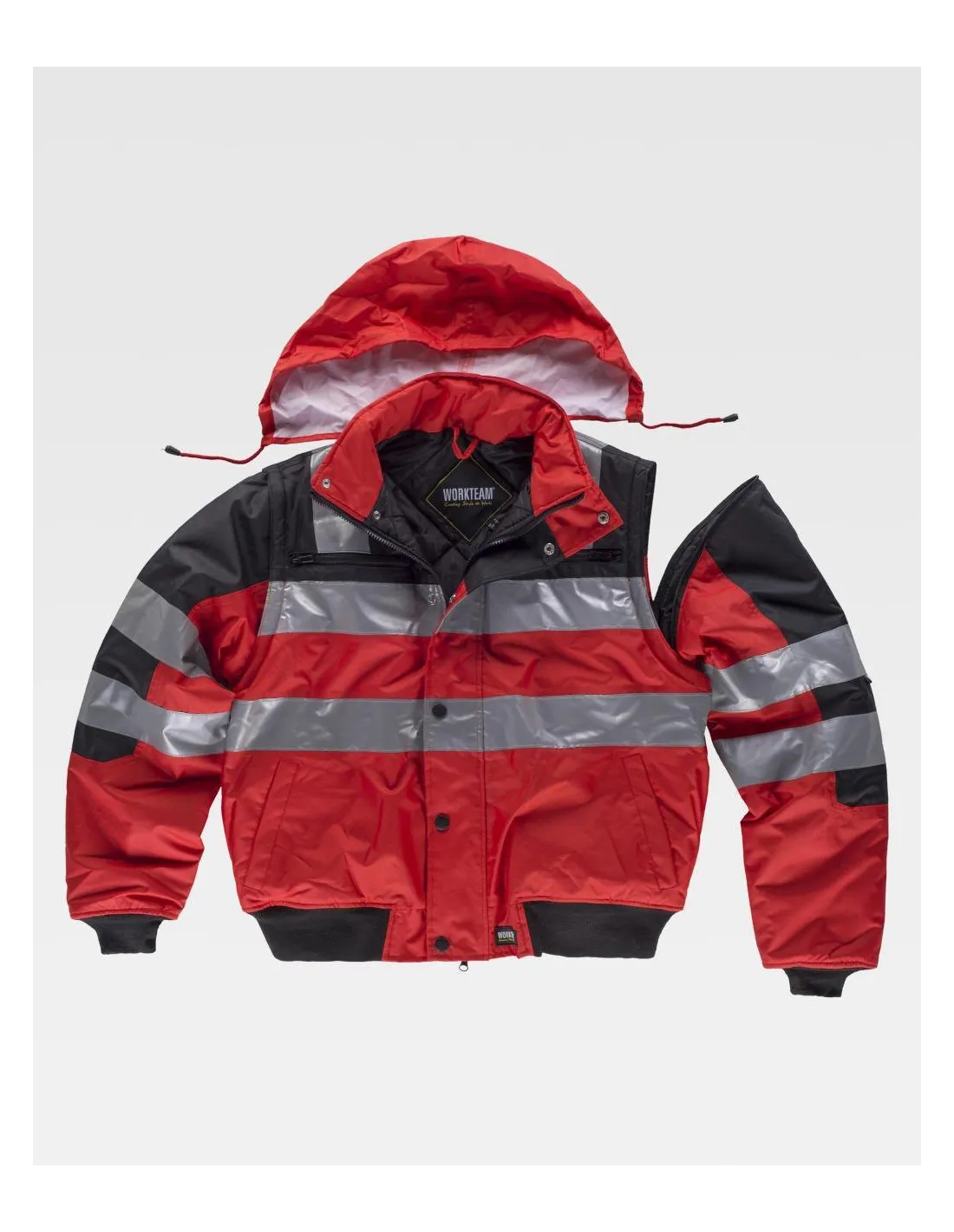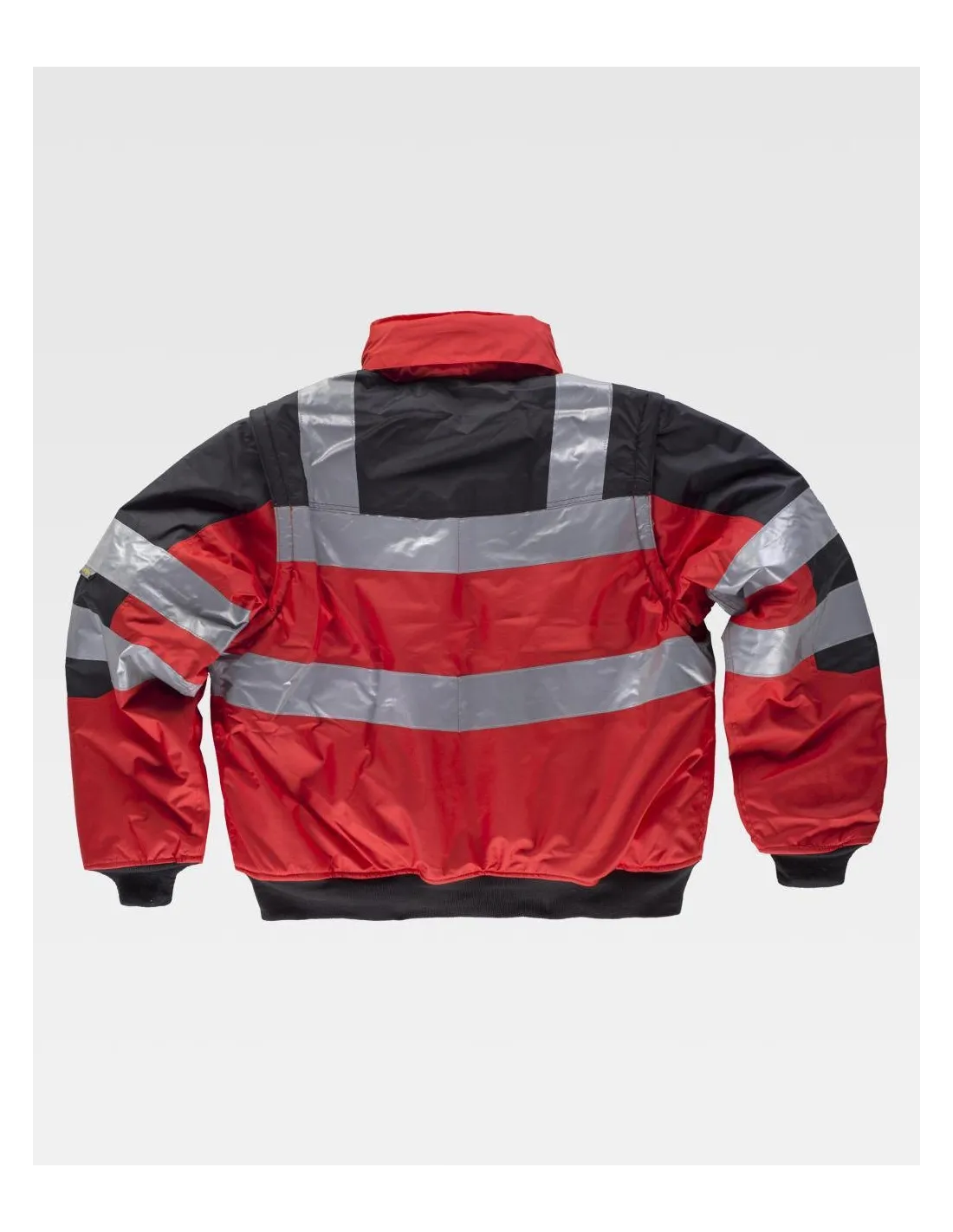Piloto acolchada e impermeable en tejido Oxford, combinada, con mangas desmontables y cintas reflectantes. Disponible en colores amarillo/negro, naranja/negro y rojo/negro.