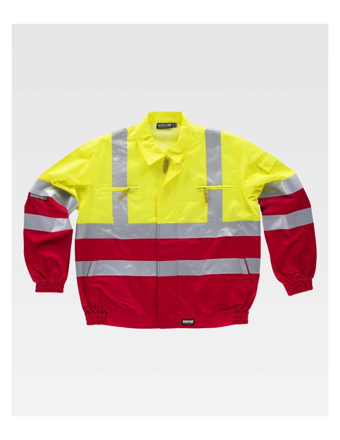 Cazadora bicolor de alta visibilidad combinada con cintas reflectantes. Disponible en colores verde/amarillo flúor, rojo/amarillo flúor y azulina/amarillo flúor.