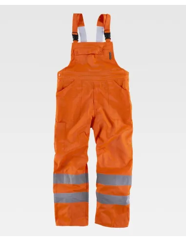 Peto de alta visibilidad con cintas reflectantes y media espalda cubierta. Un bolso de pecho de plastón con cartera de botones, dos bolsos de abertura inclinada en los costados. Un bolso trasero de plastón y un bolso de espátula. Tirantes con elástico y hebillas automáticas. Cierre de botones en los laterales y bragueta de cremallera de nylon. Elástico en la espalda. Composición 50% Poliéster 50% Algodón