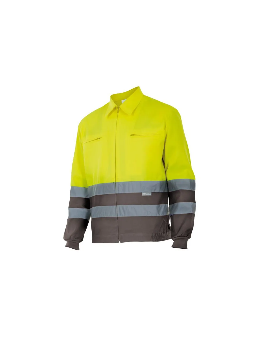 Cazadora bicolor de alta visibilidad confeccionada en poliéster y algodón del fabricante Velilla, con un cierre con cremallera en zona central, cintas reflectantes en torso y mangas, cinturilla elástica y puños de canalé. Disponible en varias combinaciones de colores.