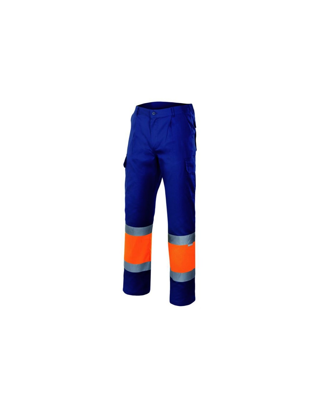 Pantalón bicolor forrado de alta visibilidad confeccionado en poliéster y algodón, con un cierre con cremallera y botón en zona central, cintas reflectantes en piernas, cinturilla elástica y costura de seguridad. Disponible en varias combinaciones de colores.