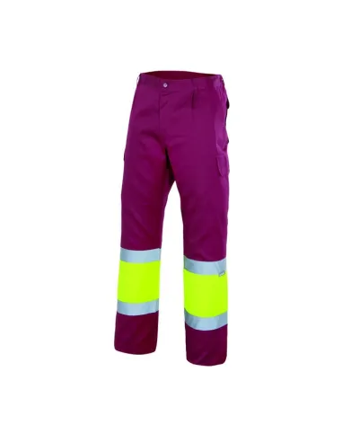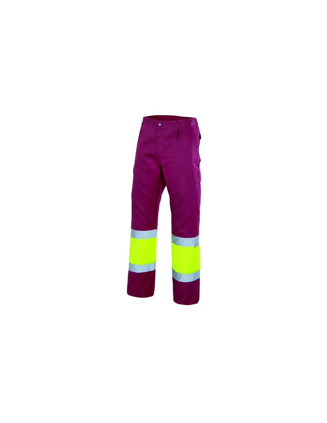 Este pantalón bicolor de alta visibilidad está confeccionado en poliéster y algodón, cuenta con un cierre con cremallera y botón en la zona central, cintas reflectantes en piernas, cinturilla elástica y costura de seguridad en la parte trasera. Disponible en varias combinaciones de colores.