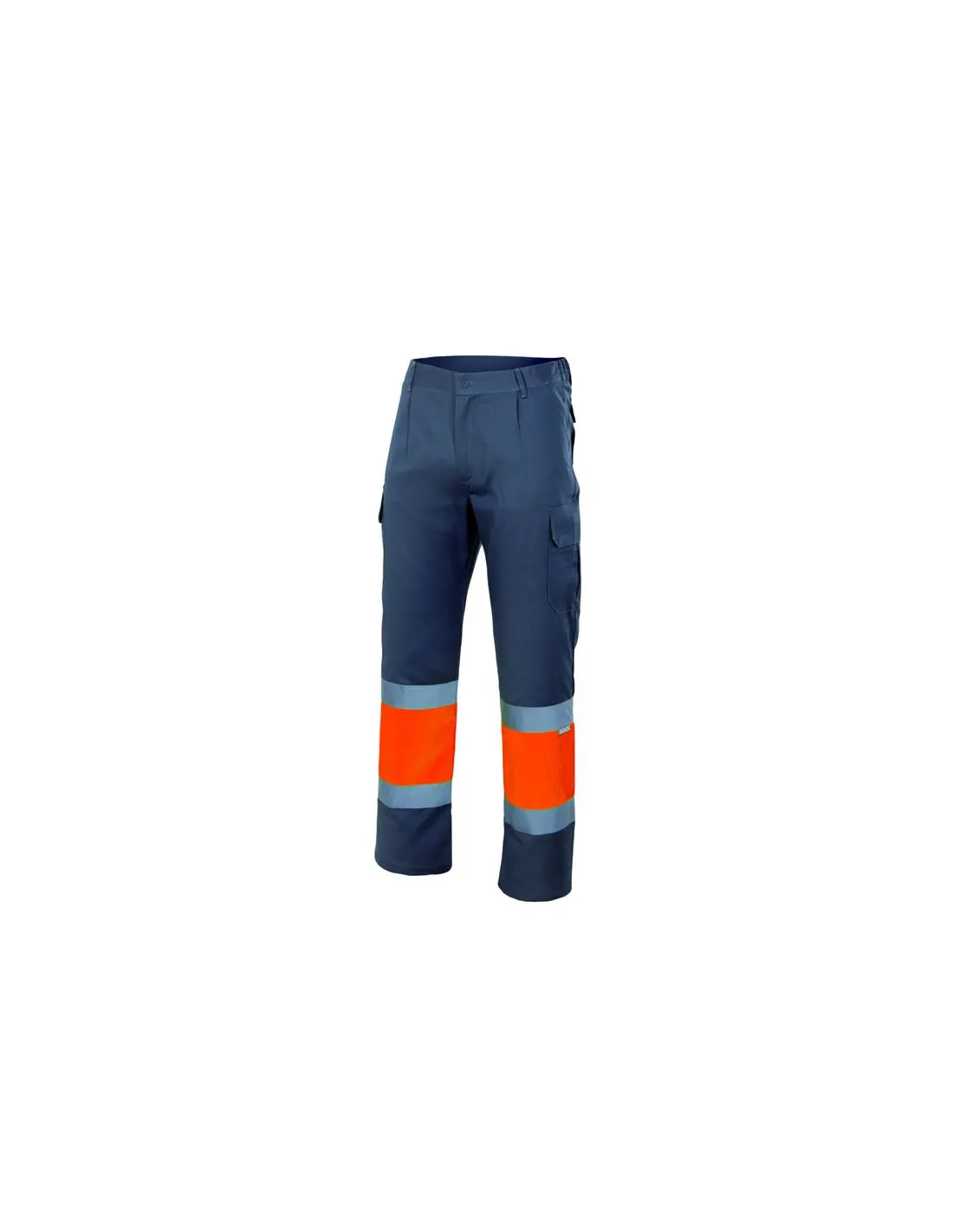 Pantalón bicolor de alta visibilidad confeccionado en poliéster y algodón, con un cierre con cremallera y botón en zona central, cintas reflectantes en piernas, cinturilla elástica y costura de seguridad. Disponible en varias combinaciones de colores.