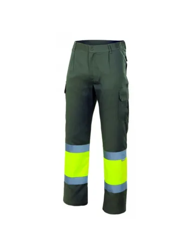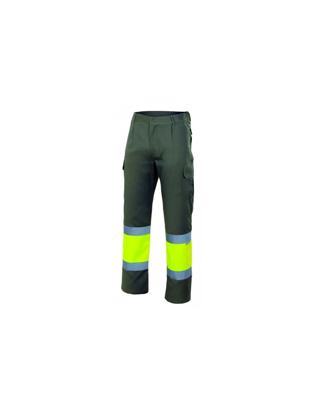 Pantalón bicolor de alta visibilidad confeccionado en poliéster y algodón, con un cierre con cremallera y botón en zona central, cintas reflectantes en piernas, cinturilla elástica y costura de seguridad. Disponible en varias combinaciones de colores.