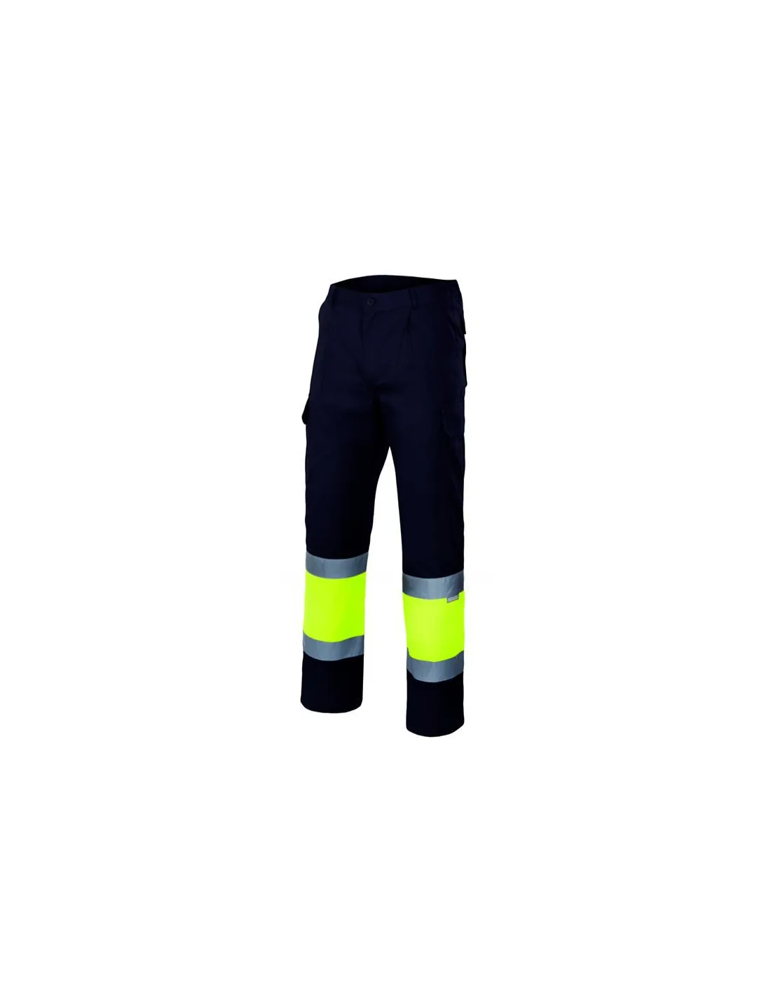 Pantalón bicolor de alta visibilidad confeccionado en poliéster y algodón, con un cierre con cremallera y botón en zona central, cintas reflectantes en piernas, cinturilla elástica y costura de seguridad. Disponible en varias combinaciones de colores.