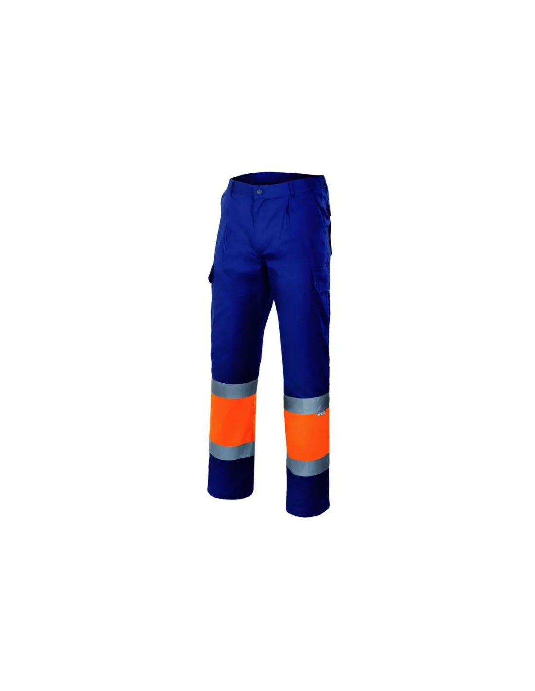Pantalón bicolor de alta visibilidad confeccionado en poliéster y algodón, con un cierre con cremallera y botón en zona central, cintas reflectantes en piernas, cinturilla elástica y costura de seguridad. Disponible en varias combinaciones de colores.