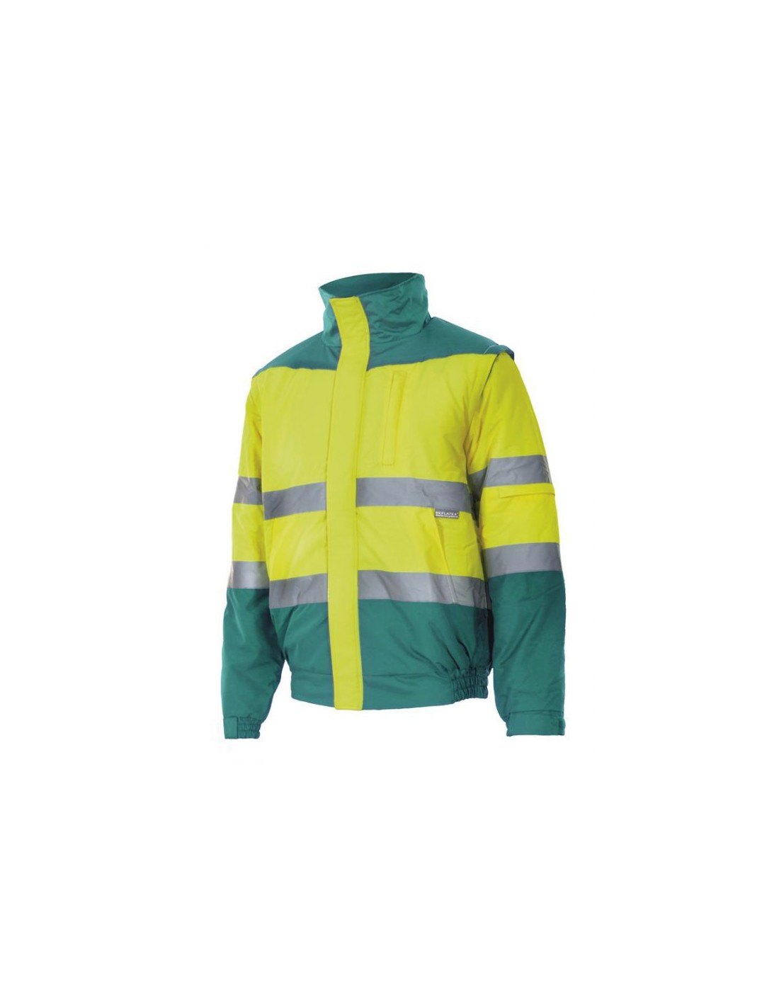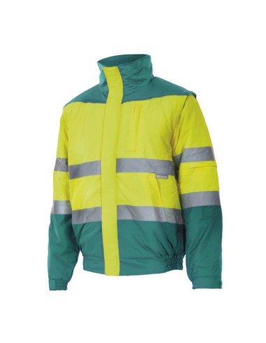 Cazadora bicolor acolchada de alta visibilidad confeccionada 100% en poliéster, con un cierre con cremallera en zona central, tapeta con cierre de velcro, cintas reflectantes en torso y mangas, capucha oculta, cuello de forro polar, mangas desmontables, cinturilla elástica y puños elásticos con cierre de velcro. Disponible en varias combinaciones.