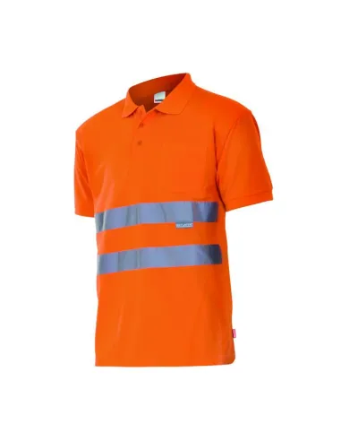 Polo de manga corta de alta visibilidad confeccionado 100% en poliéster, con cierre con botones, cintas reflectantes y cuello y bajo de la manga en canalé. Disponible en amarillo flúor y naranja flúor.