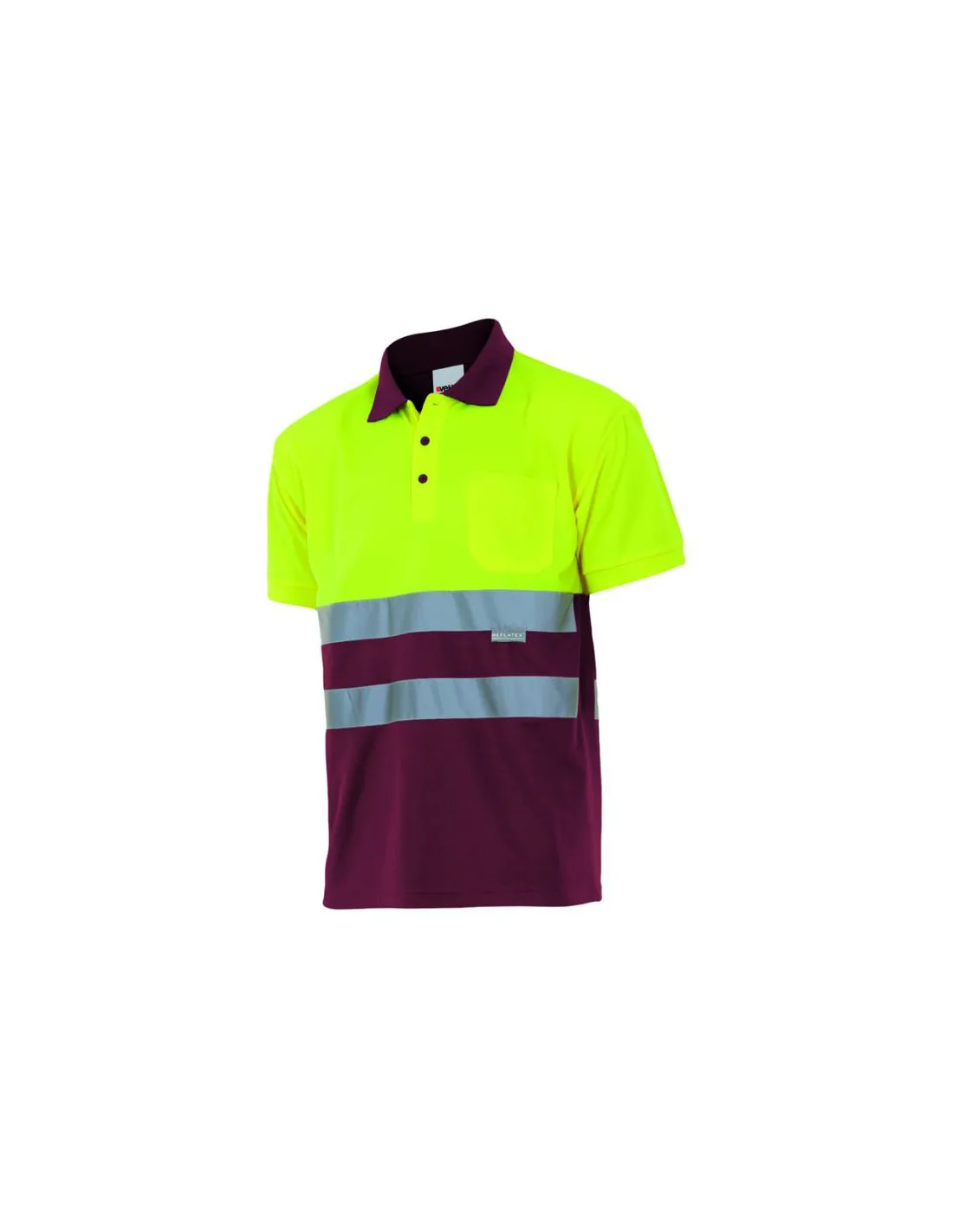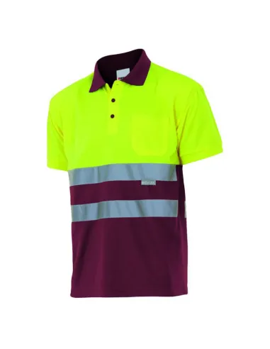 Este polo bicolor de manga corta de alta visibilidad está confeccionado 100% en poliéster, cuenta con un cierre con botones en la zona central, cintas reflectantes en torso y cuello y bajo de la manga en canalé. Disponible en amarillo flúor y naranja flúor.