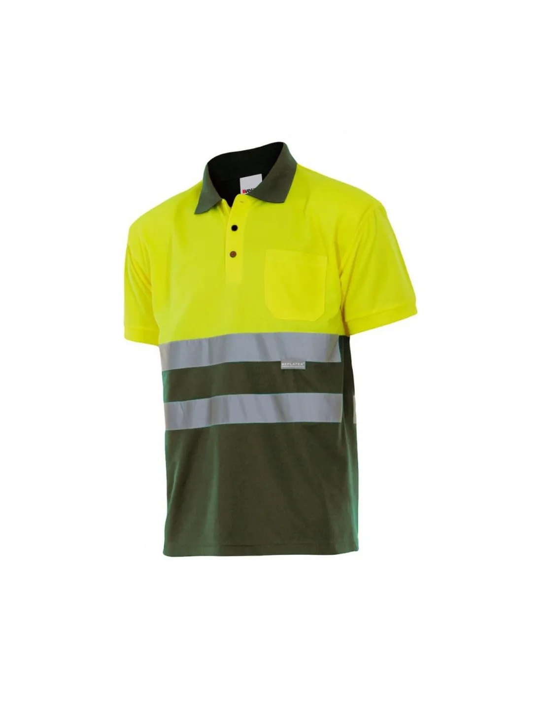 Polo bicolor de manga corta de alta visibilidad confeccionado 100% en poliéster, con cierre con botones, cintas reflectantes y cuello y bajo de la manga en canalé. Disponible en amarillo flúor y naranja flúor.