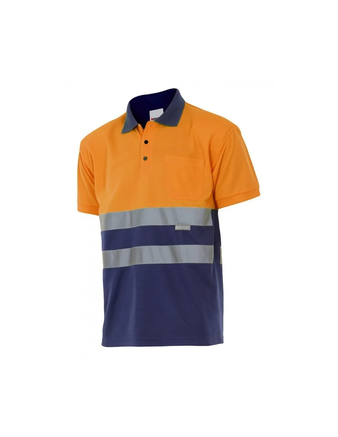Polo bicolor de manga corta de alta visibilidad confeccionado 100% en poliéster, con cierre con botones, cintas reflectantes y cuello y bajo de la manga en canalé. Disponible en amarillo flúor y naranja flúor.
