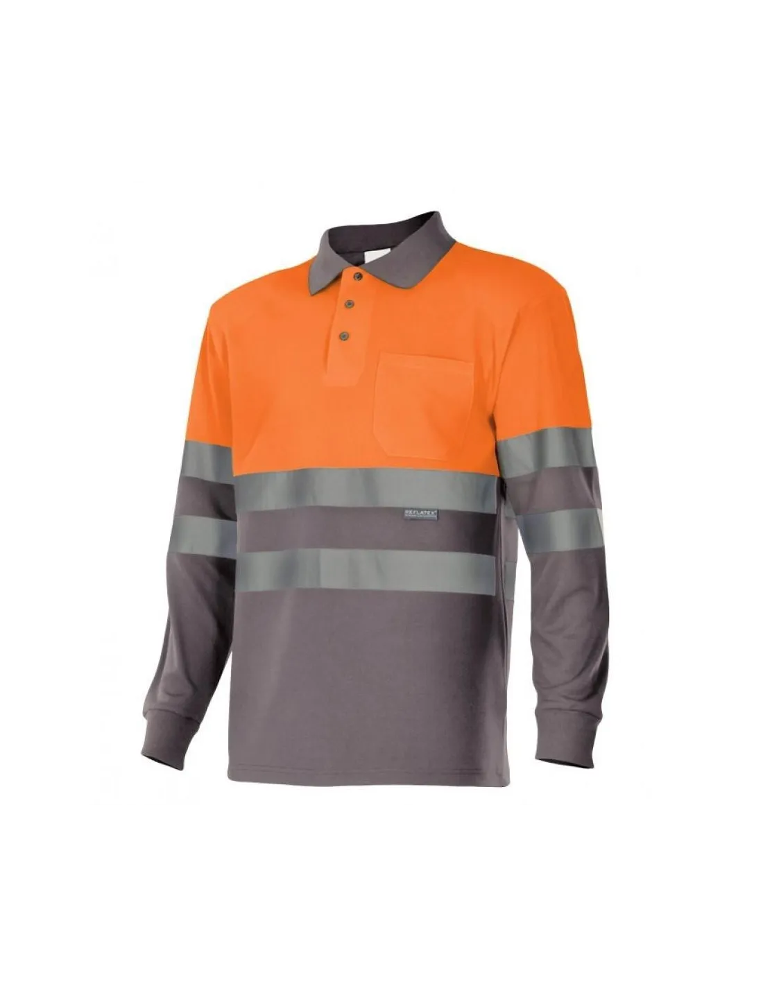 Polo bicolor de manga larga de alta visibilidad confeccionado 100% en poliéster, con cierre con botones, cintas reflectantes y cuello y bajo de la manga en canalé. Disponible en amarillo flúor y naranja flúor.