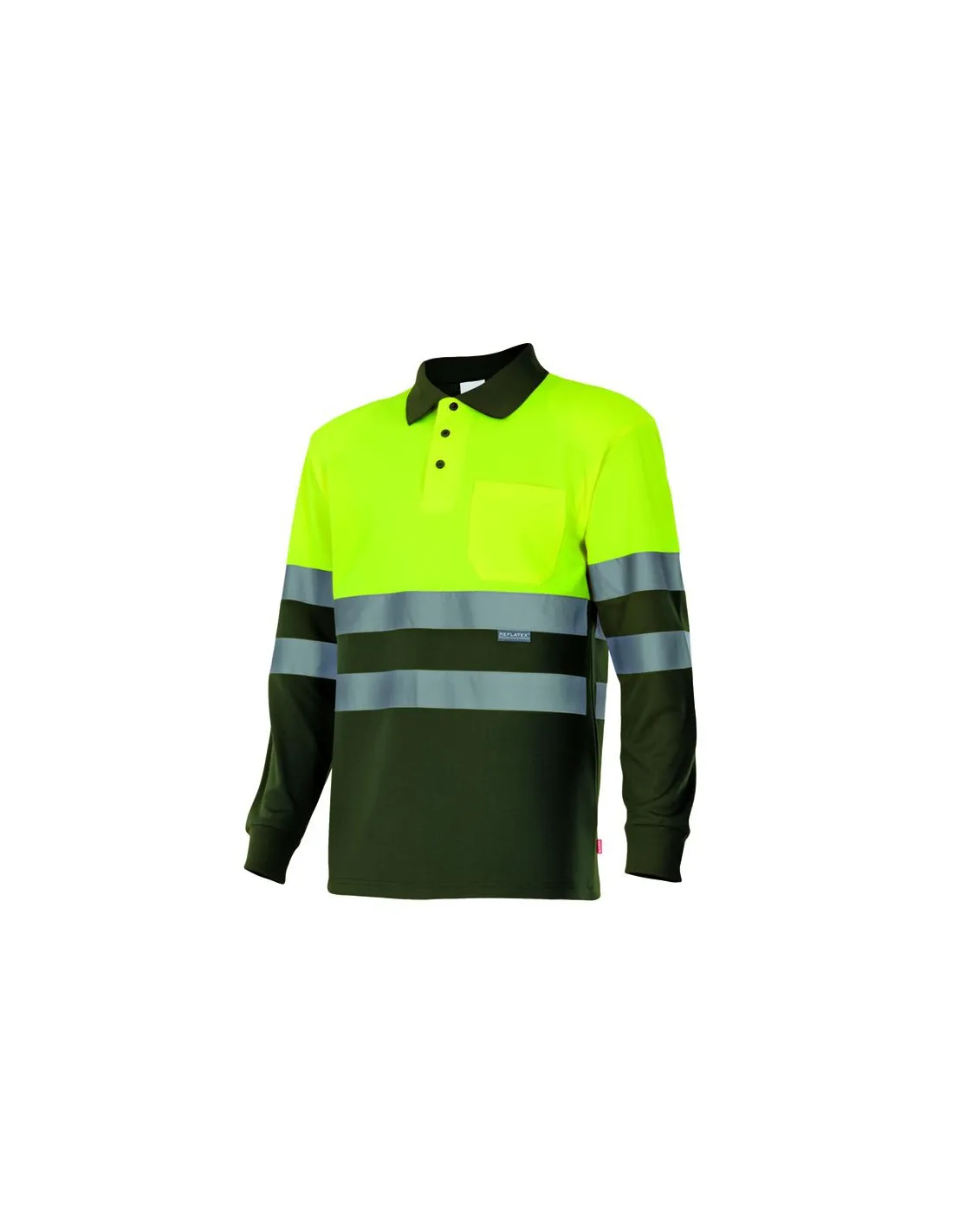 Polo bicolor de manga larga de alta visibilidad confeccionado 100% en poliéster, con cierre con botones, cintas reflectantes y cuello y bajo de la manga en canalé. Disponible en amarillo flúor y naranja flúor.