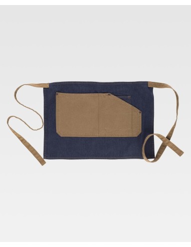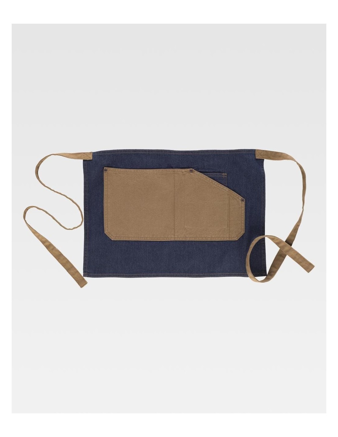 Delantal de estilo francés corto con un tejido vaquero, con un bolsillo en color beige en el centro con un corte asimétrico compartiendo con un bolsillo relojero en la parte del interior, cintas también de color beige combinado así con el bolsillo central.