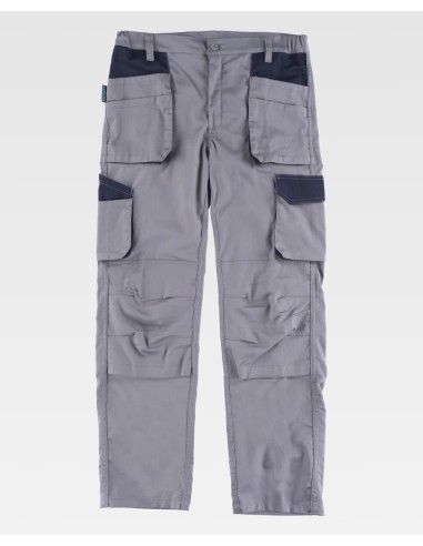 Pantalón combinado de tejido elástico. Dos bolsos de carga en los costados con bolsos superpuestos. Un bolso lateral de carga con cartera de velcro y otro de espátula doble. Dos bolsos traseros de plastón y cartera de velcro. Refuerzo con cierre de velcro para rodilleras de protección. Elástico en los laterales de la cintura. Trabillas. Cierre de botón metálico y bragueta de cremallera metálica. Composición 64% Poliéster 34% Algodón 2% Elastano