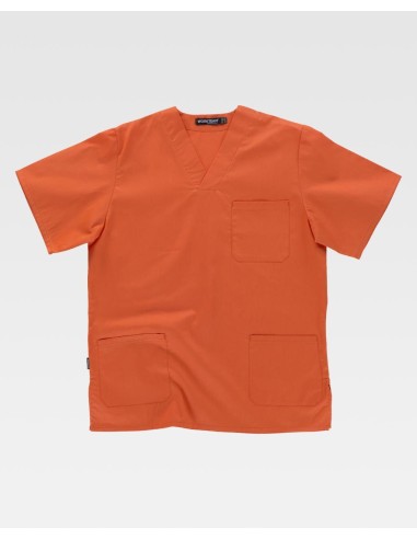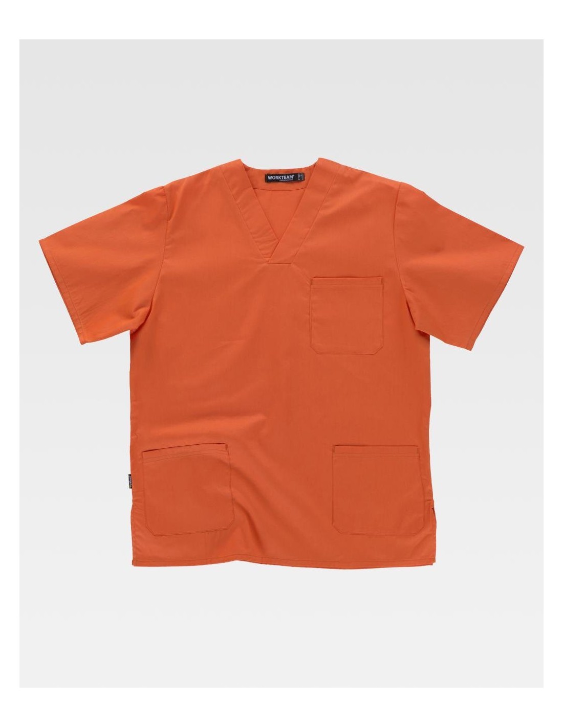 Casaca sanitaria unisex de manga corta y escote de pico cruzado. Un bolso de pecho y dos bolsos laterales de plastón. Aberturas en los costados. Composición 65% Poliéster 35% Algodón
