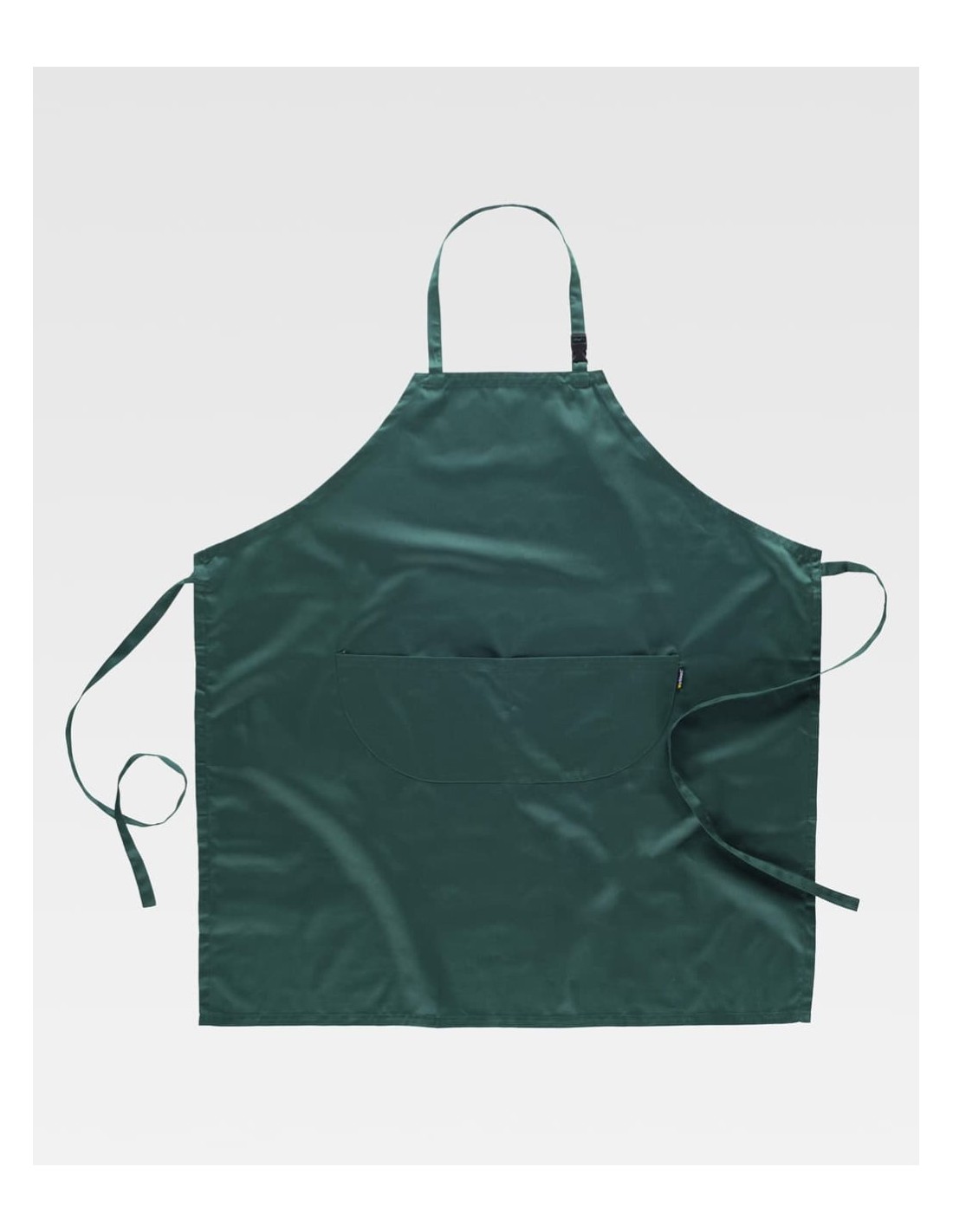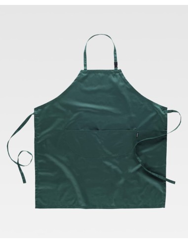 Delantal con peto, con un bolso redondeado en el centro del producto, un cuello con hebilla regulable para que se pueda ajustar a la persona, incorpora también unas tiras para ajustar a la cintura, y el tamaño del delantal de Workteam es de 90x95cm.