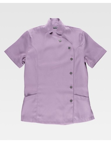 Casaca entalla de la marca de Workteam de señora de manga corta y de cuello Mao, con un cierre lateral redondeado con corchetes cuadrados de metal, los laterales bolsillos de plastón laterales de abertura inclinada.